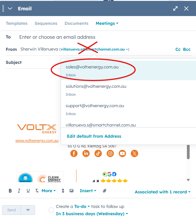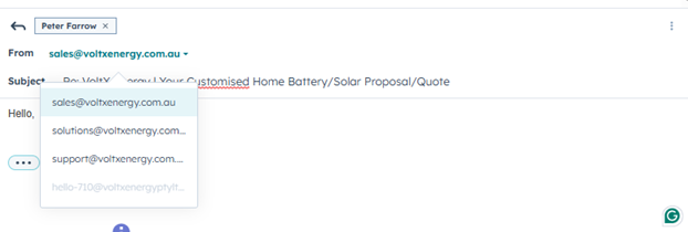 Always use this email address when communicating with our customers. Your HubSpot email address might be the one appearing on the "From" address bar, so you have to change it to sales@voltxenergy.com.au